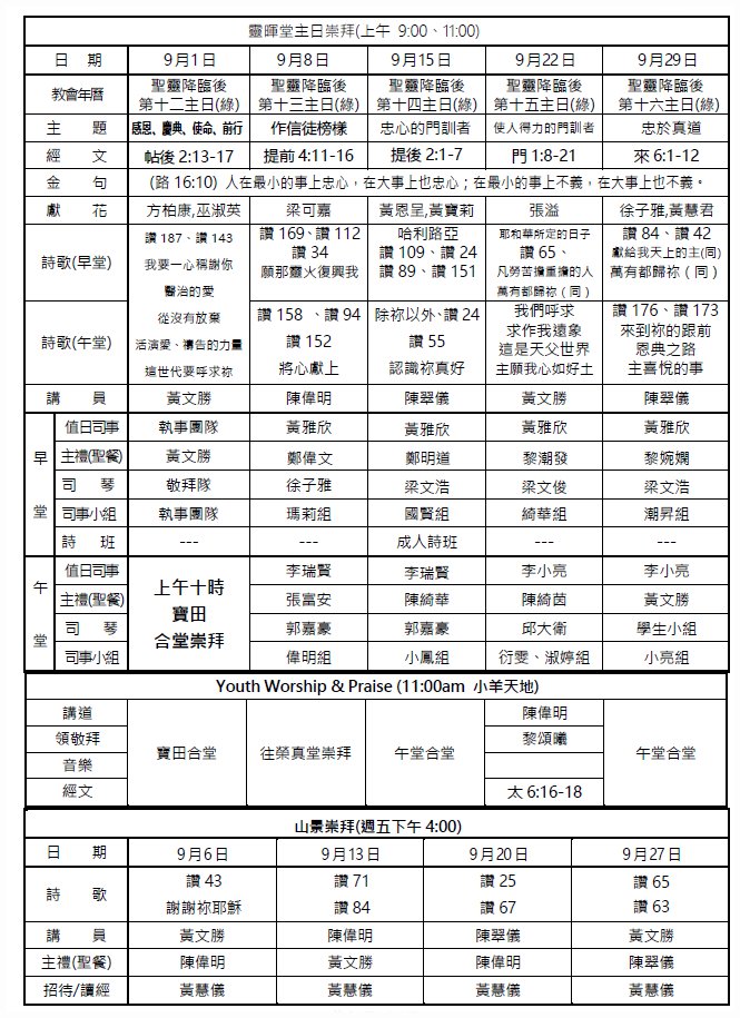 2019年09月份事奉輪值表